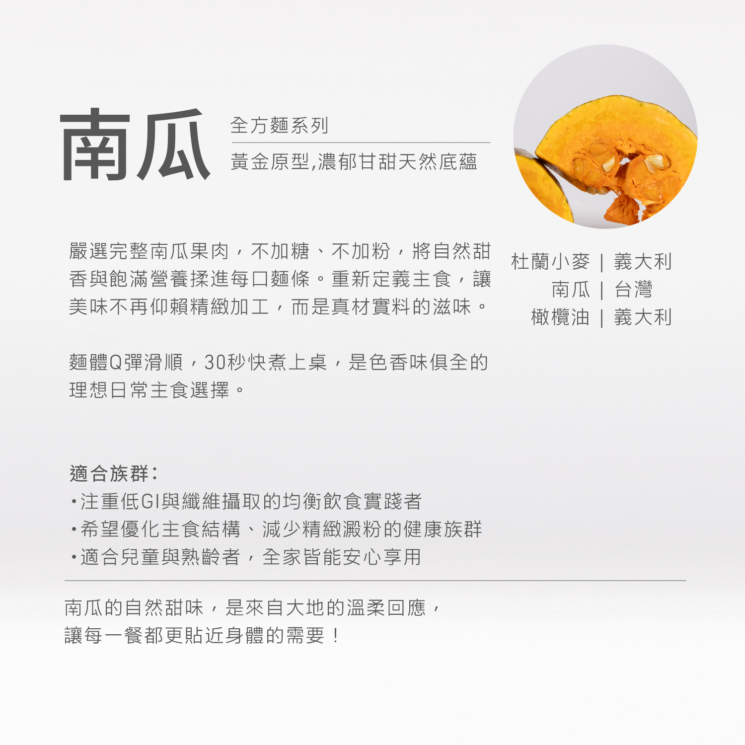 嚴選色澤飽滿、香氣自然的高營養南瓜,富含β-胡蘿蔔素與膳食纖維,經 ALL IN 專利離心力技術,完美融入低升糖的杜蘭小麥麵體,黃澄柔韌的麵條不僅口感彈牙滑順,更散發出自然甘甜,像是將整片金黃色的南瓜田揉進麵裡,每一口都吃得到自然的健康與真實。